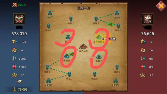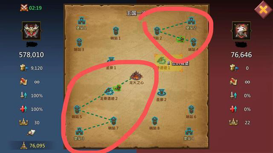 龍火之心四周的驗(yàn)分圣泉和遺跡(見(jiàn)下圖)要搶先占據(jù)。1個(gè)遺跡加50攻擊,王國(guó)玩龍能累加,紀(jì)元兩個(gè)遺跡是龍火100攻。